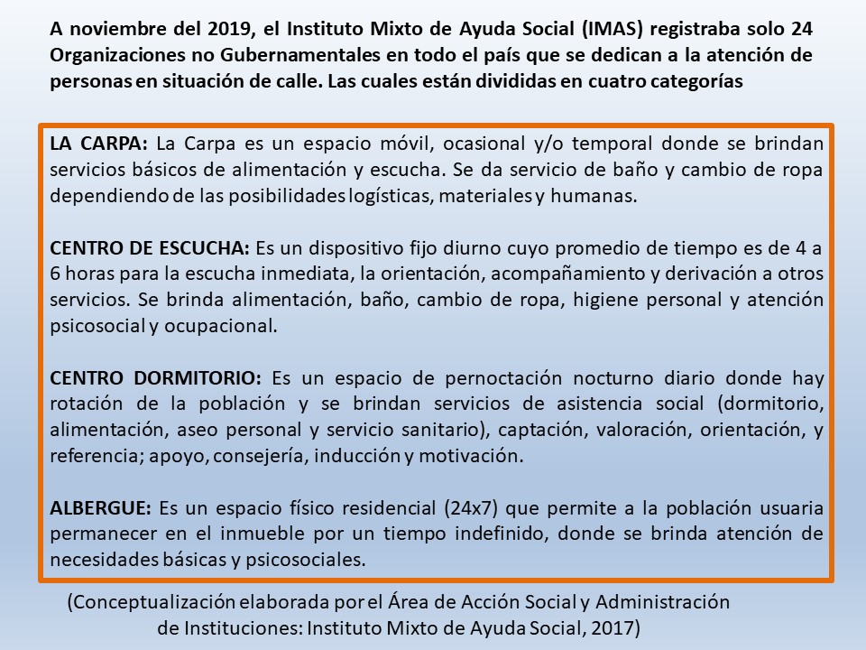 Según datos suministrados por el Sistema de Información de Población objetivo del Instituto Mixto de Ayuda Social (IMAS) a enero del 2020 más de 3.837 personas se encontraban en condición de calle. De ellos, 3.387 son hombres, 448 son mujeres y dos están en la categoría de intersexo.