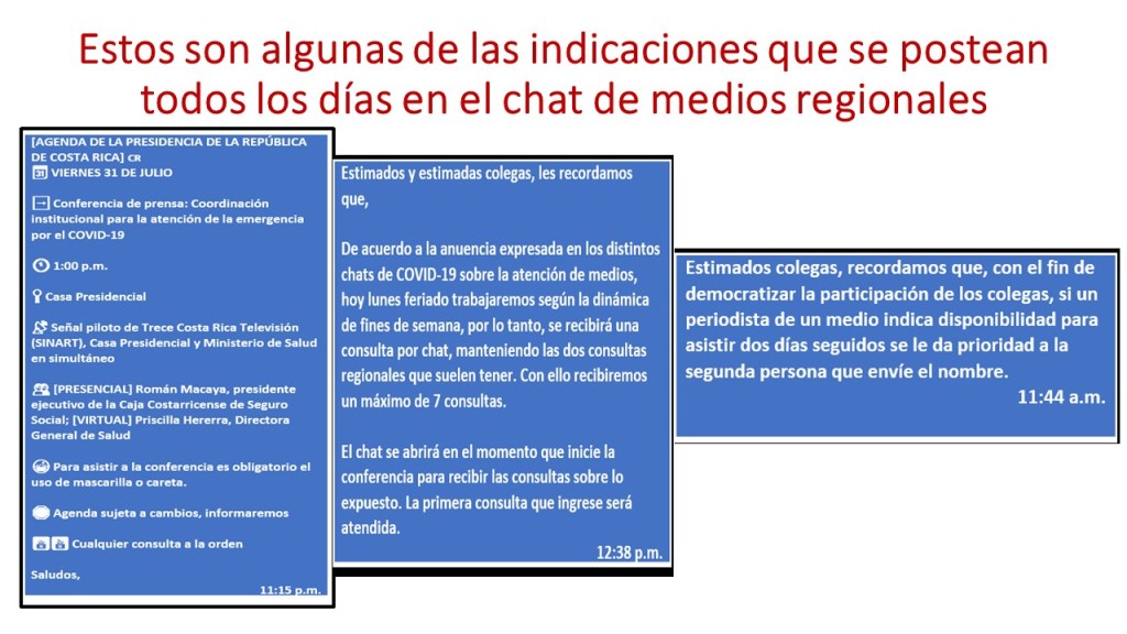 Paso seguido, se solicitó a los medios acreditarse por medio de una plataforma digital para participar de las ruedas de prensa diarias. Luego se habilitó dos chats de prensa y se procedió a separar los medios: los de cobertura nacional y los medios regionales.