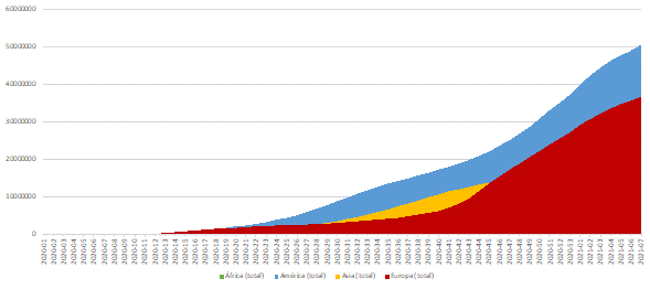 Gráfico 1. Acumulado de casos de COVID-19 por continente.