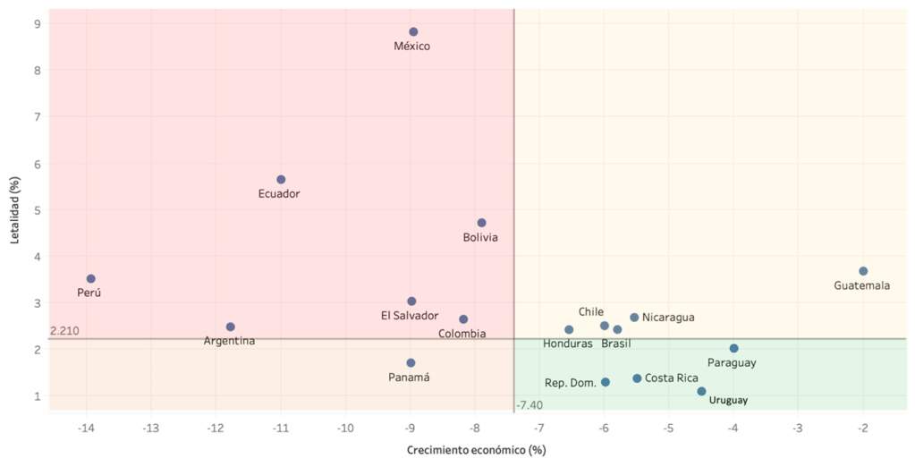 Y por último países que tuvieron altos niveles de letalidad y también altos niveles de pérdidas económicas como Colombia, El Salvador, Bolivia, Argentina, Perú, Ecuador y México. En este grupo se encuentra el país con la mayor caída en su PIB, con -13.94% que es Perú; y también el país con la mayor letalidad reportada con 8.83% que es México.