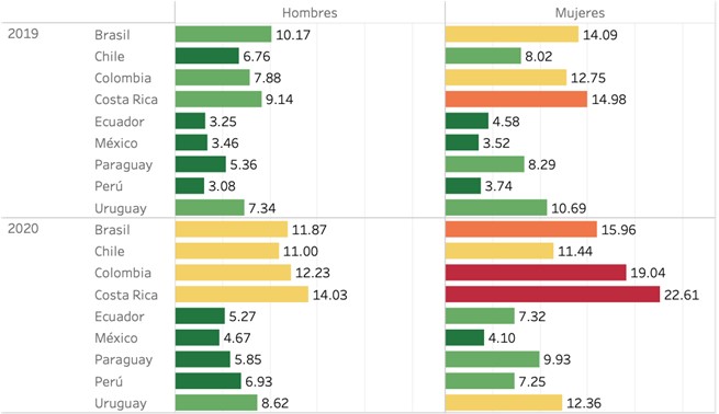 En contraste, el desempleo de los hombres en estos países aumentó en promedio 2.6%, siendo también Colombia y Costa Rica los que más aumentaron su desempleo con tasas de 4.35% y 4.89% cada uno. Cabe mencionar también que además del aumento en el desempleo, la tasa previa a la crisis era mayor para las mujeres, pues en el 2019 el promedio de tasa de desempleo de los hombres era de 6.3% y el de las mujeres 8.9%. Siendo Brasil el país con la mayor tasa de desempleo de los hombres con 10.17%, y Costa Rica el país con la mayor tasa de desempleo de las mujeres con 14.98% en el 2019.