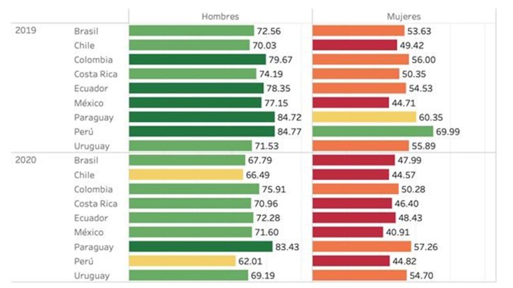 De acuerdo a los datos de la Organización Internacional del Trabajo, para los países de la región que tienen datos 2019 y 2020 (Brasil, Chile, Colombia, Costa Rica, Ecuador, México, Paraguay, Perú y Uruguay) la tasa de desempleo de las mujeres aumentó 3.3% del 2019 al 2020 producto de la pandemia; siendo Colombia y Costa Rica los países donde más aumentó el desempleo de las mujeres con 6.29% y 7.63% respectivamente.