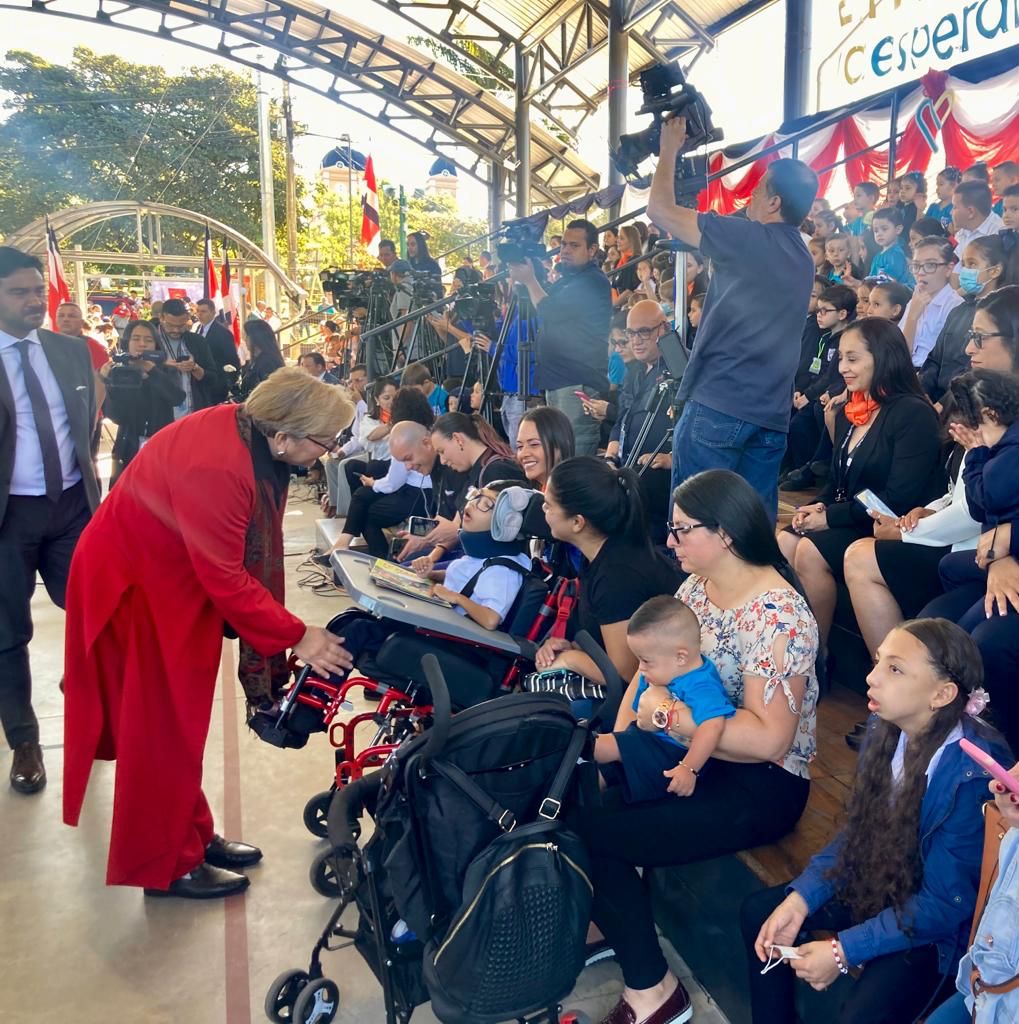 “Agradezco a la comunidad que creyó en nosotros y en cada persona de Tarrazú que se convirtió en un ángel guardián de los estudiantes, porque tenían que cruzar calles o nosotras salir a atenderlos y sabíamos que todos aquí estábamos pendientes”, dijo Cerdas. El Presidente de la República, Rodrigo Chaves Robles, asistió a la inauguración y compartió con la estudiante Noelia Sánchez Castillo, de segundo grado, quién declamó al mandatario una poesía escrita por su tío, el escritor Gustavo Castillo Durán.