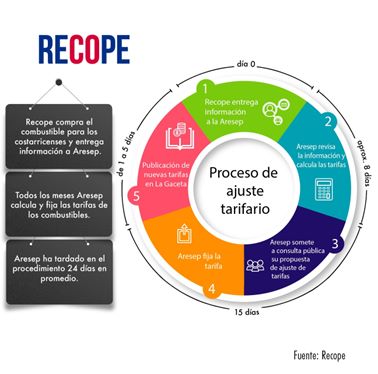 Para fijar los precios, Recope entrega a la Aresep la información relacionada con las compras de combustible que realiza el país. Esos datos son revisados por Aresep, que somete a consulta pública su propuesta de ajuste de precios. Una vez solventada esta etapa, se fijan las nuevas tarifas, las cuales entran en vigencia al día siguiente de ser publicadas en el diario oficial La Gaceta.