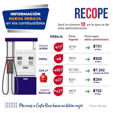 Juan Manuel Quesada, presidente de Recope, señaló que “tenemos una buena noticia para los costarricenses. Hoy, entregamos información a la Aresep para un nuevo cálculo en el precio de los combustibles y, preliminarmente, se tiene que estaríamos a las puertas de una nueva rebaja en la gasolina súper, de aproximadamente ₡17 por litro; en el diésel de ₡6 por litro y en el gas de ₡587 por cilindro de 25 libras”.